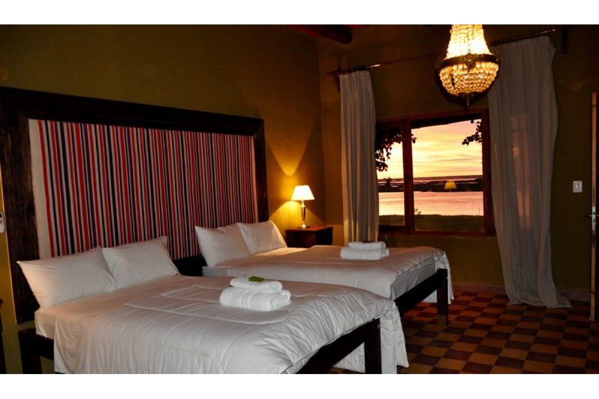 Wat betreft de kamers kun je kiezen uit standaardkamers met 2 queensize bedden die perfect zijn om te delen, driepersoonskamers met 3 queensize bedden en de grootste kamer met een kingsize bed. Alle kamers hebben een panoramisch uitzicht op de Corriente rivier en de delta.