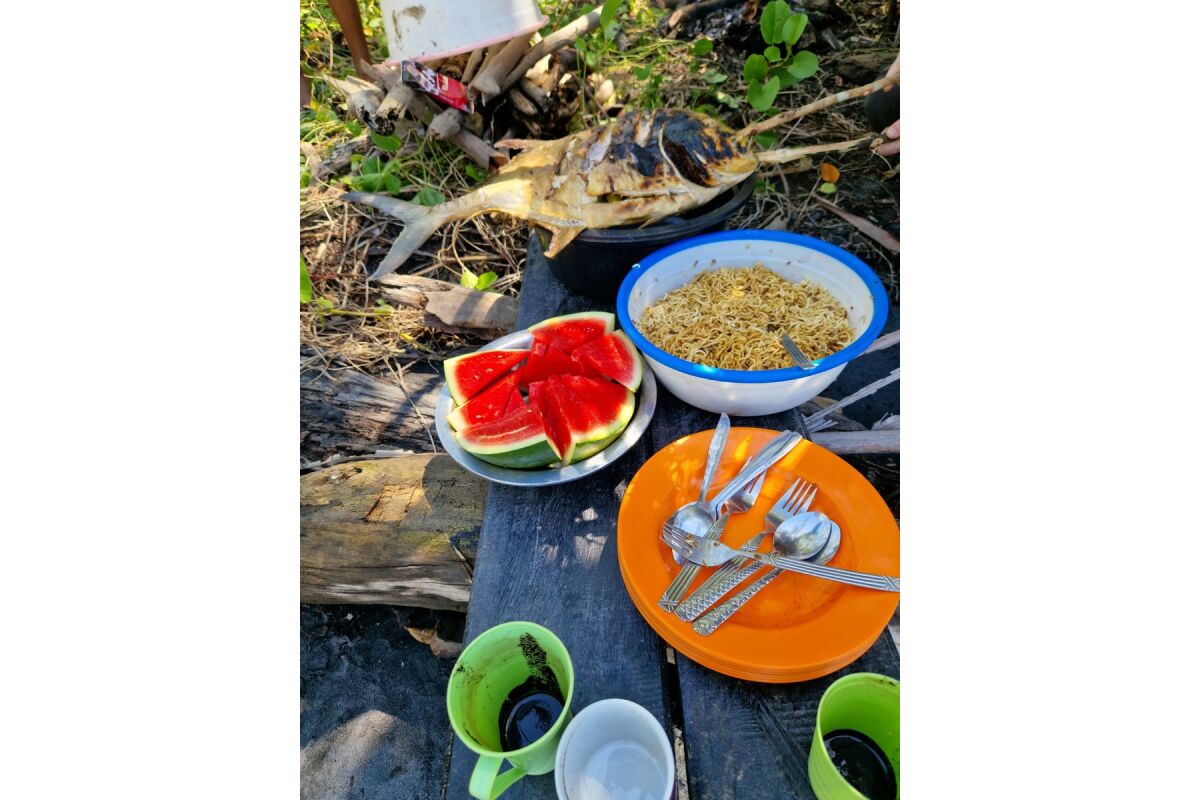 Het gebied waar we op barramundi vissen ligt aan de zuidkust van Papua en wordt gekenmerkt door ondiep water (1 tot 3-4 meter) met zandbanken en eilanden met soms behoorlijk wat stroming (afhankelijk van het getij). Vissen gebeurt hoofdzakelijk vanaf de kant, wadend in ondiep water, rond het eiland waar we kamperen of andere zandbanken/-eilanden. Zoutwaterkrokodillen komen in dit gebied gek genoeg niet voor. Omdat je vanaf het eiland kunt vissen, kun je dus zo je hengel pakken en gaan vissen, nog voor het ontbijt klaar is (als het tij goed is tenminste). De twee boten die mee zijn worden ook gebruikt om vanuit te vissen. Op barramundi, maar zeker ook voor queenfish die vaak wat verder uit de kant zitten.
