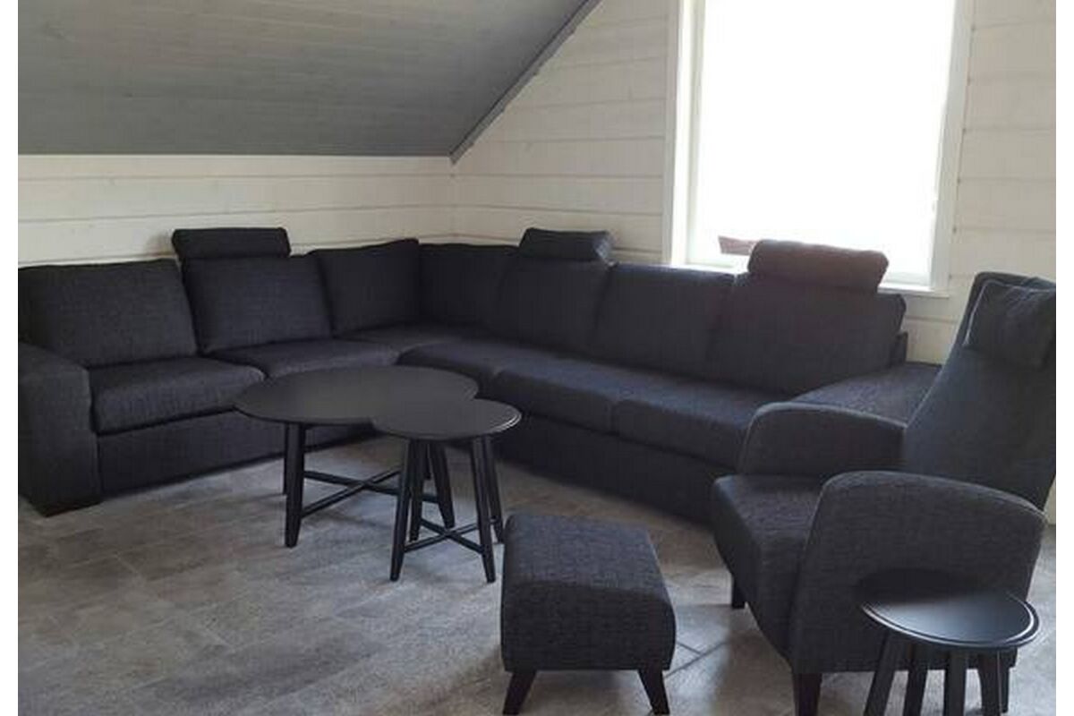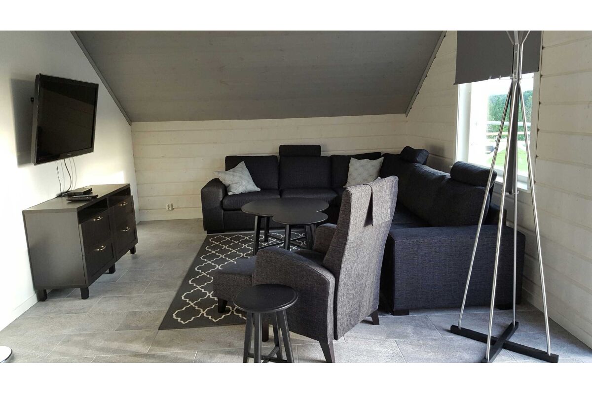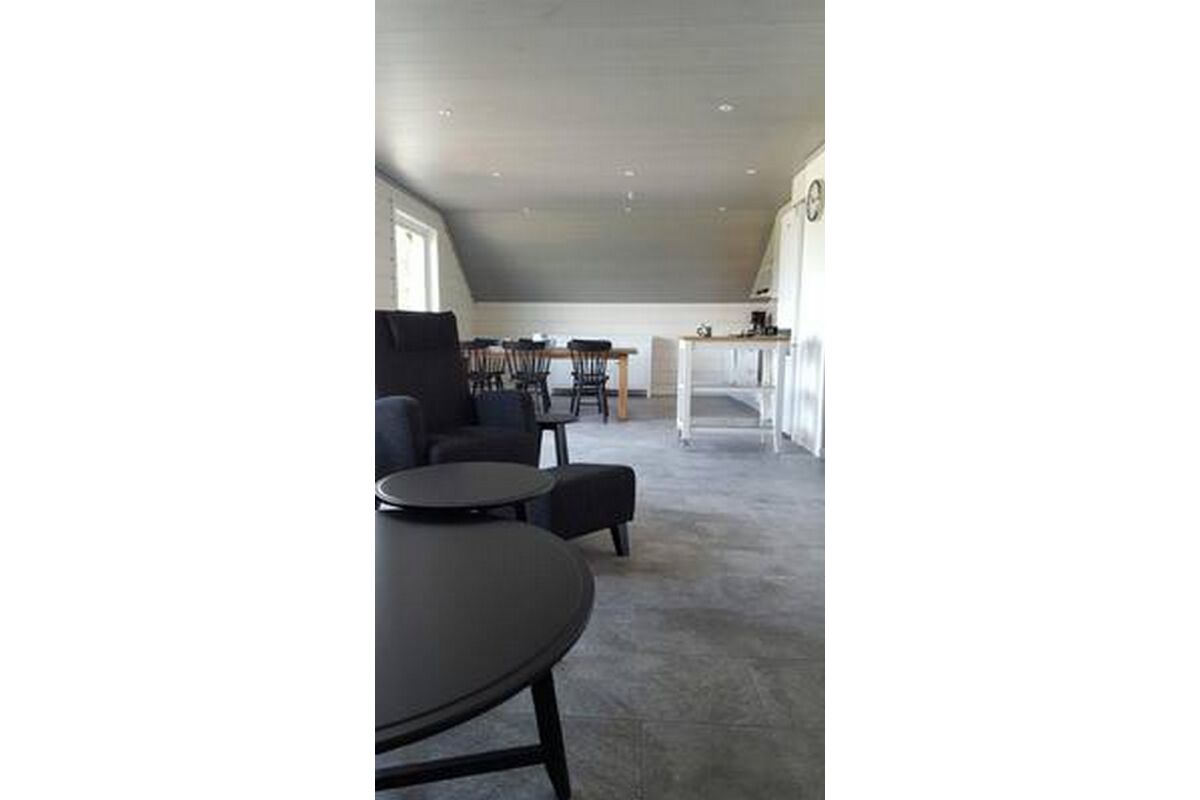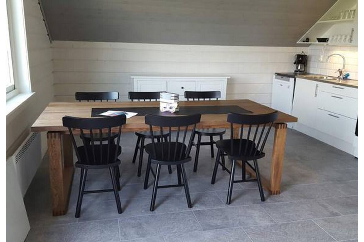 Er staat een leren bank in de woonkamer als ook een houtkachel en TV en er is een eetruimte in de open keuken. Er is ook een ruime badkamer met douche / toilet en nog een groot terras met buitenmeubilair.