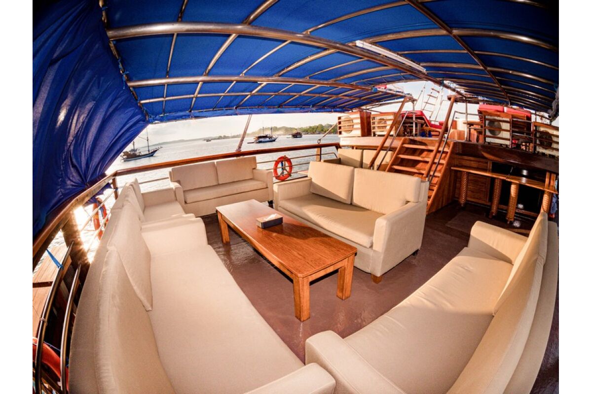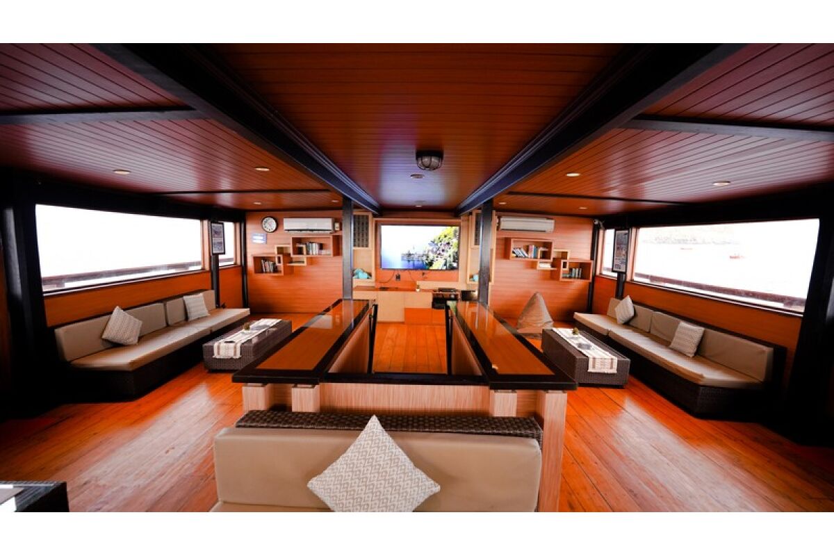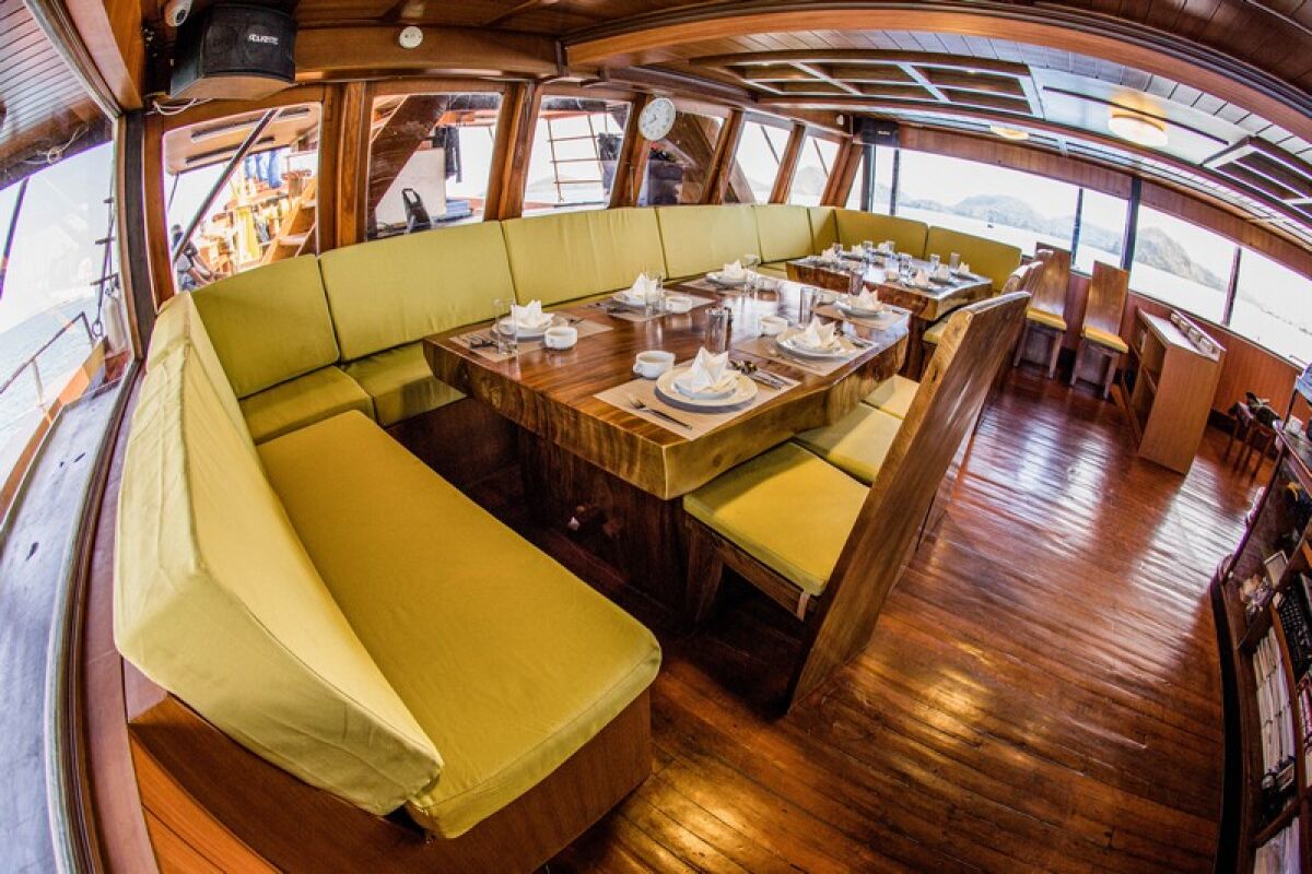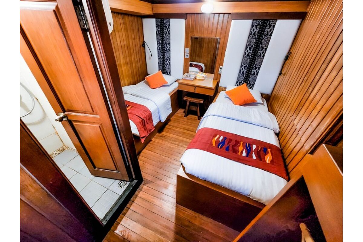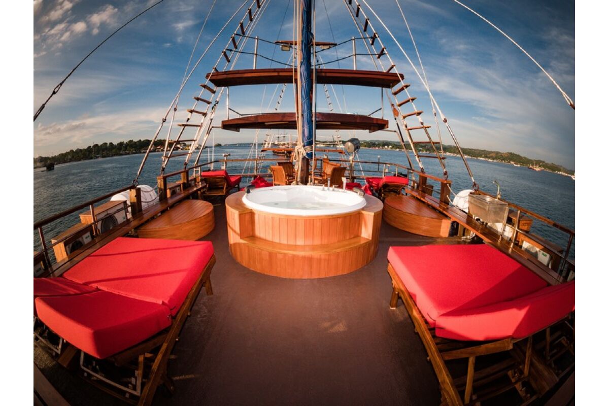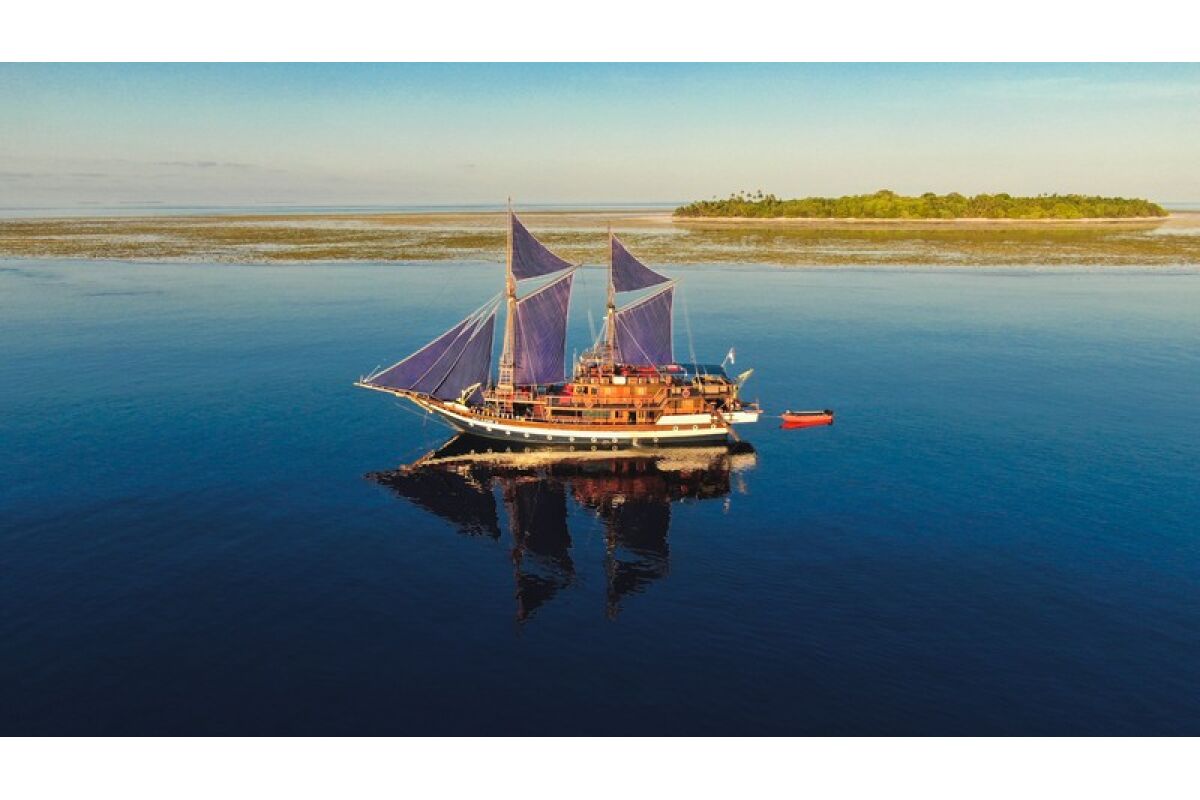 Phinisi Buginese Schoener: Ulin / Ironwood, Indonesië, 7 - 10 knopen, 35 m lengte, 10,65 m breedte; Accommodaties: 14 luxe hutten: 26 gasten, 6 hutten met tweepersoonsbed, 6 hutten met twee eenpersoonsbedden, 2 hutten met een eenpersoonsbed, en-suite badkamer met warme & koude douche, hutten met airconditioning, haardroger, badjas & handdoeken, kluisje