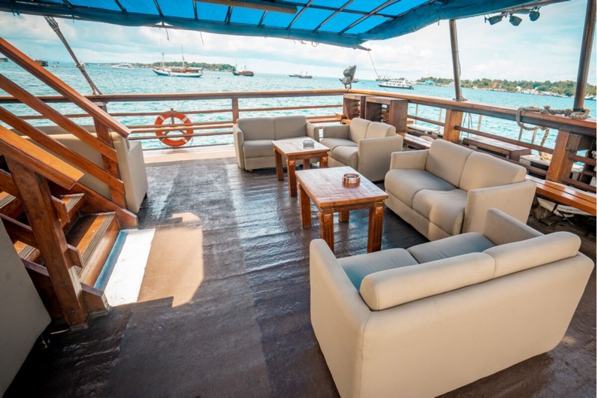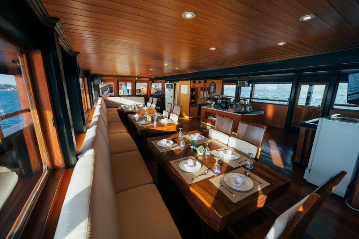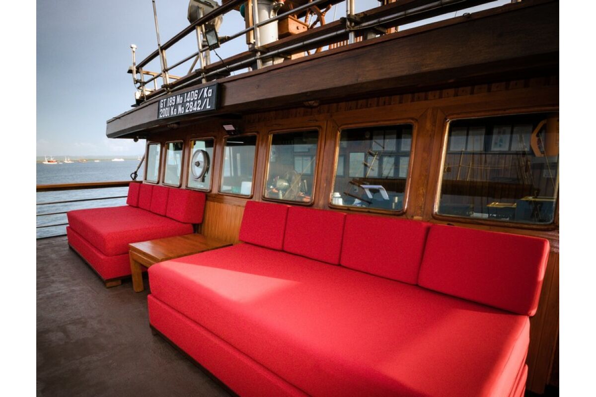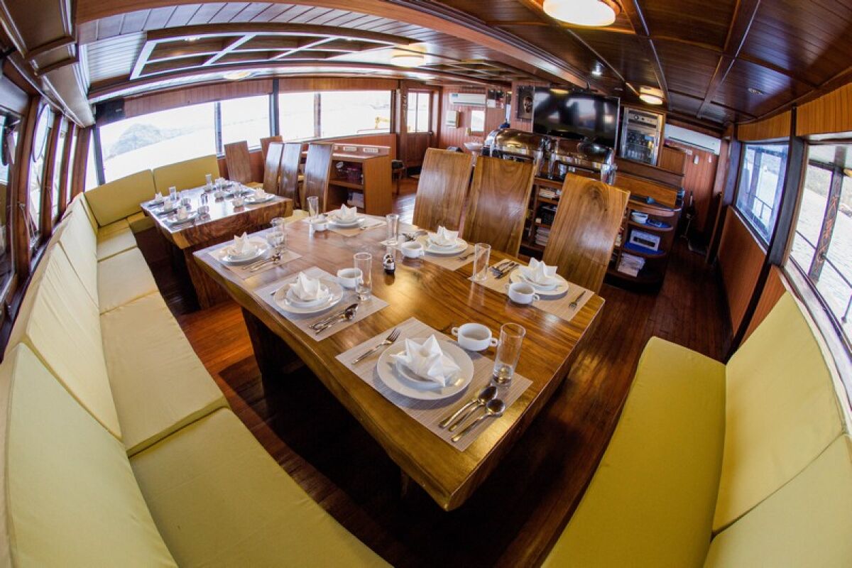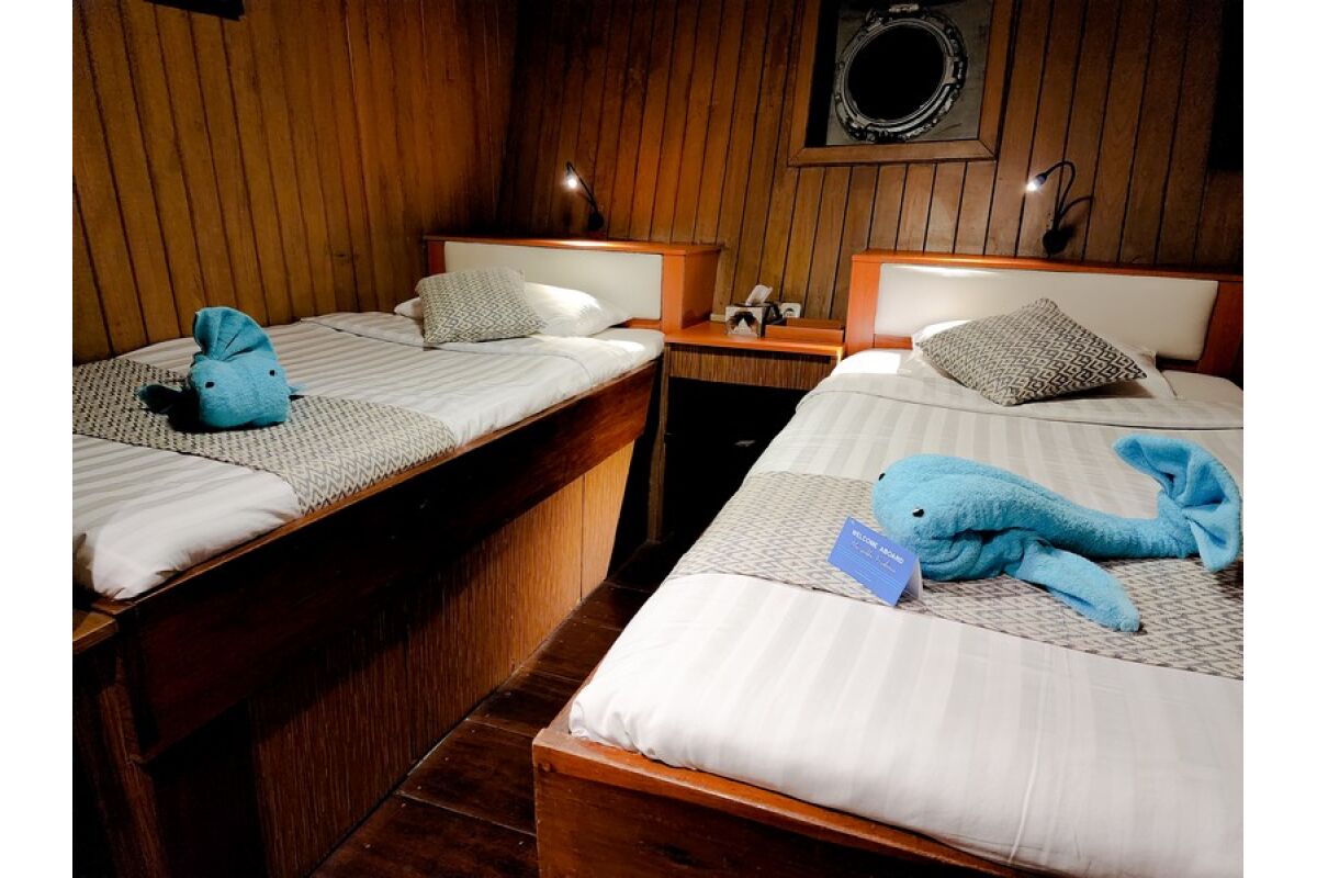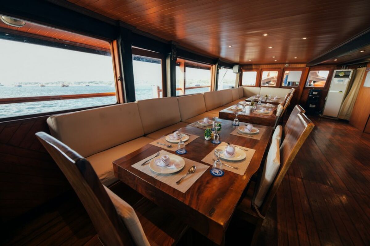 Phinisi Buginese Schoener: Ulin / Ironwood, Indonesië, 7 - 10 knopen, 35 m lengte, 10,65 m breedte; Accommodaties: 14 luxe hutten: 26 gasten, 6 hutten met tweepersoonsbed, 6 hutten met twee eenpersoonsbedden, 2 hutten met een eenpersoonsbed, en-suite badkamer met warme & koude douche, hutten met airconditioning, haardroger, badjas & handdoeken, kluisje