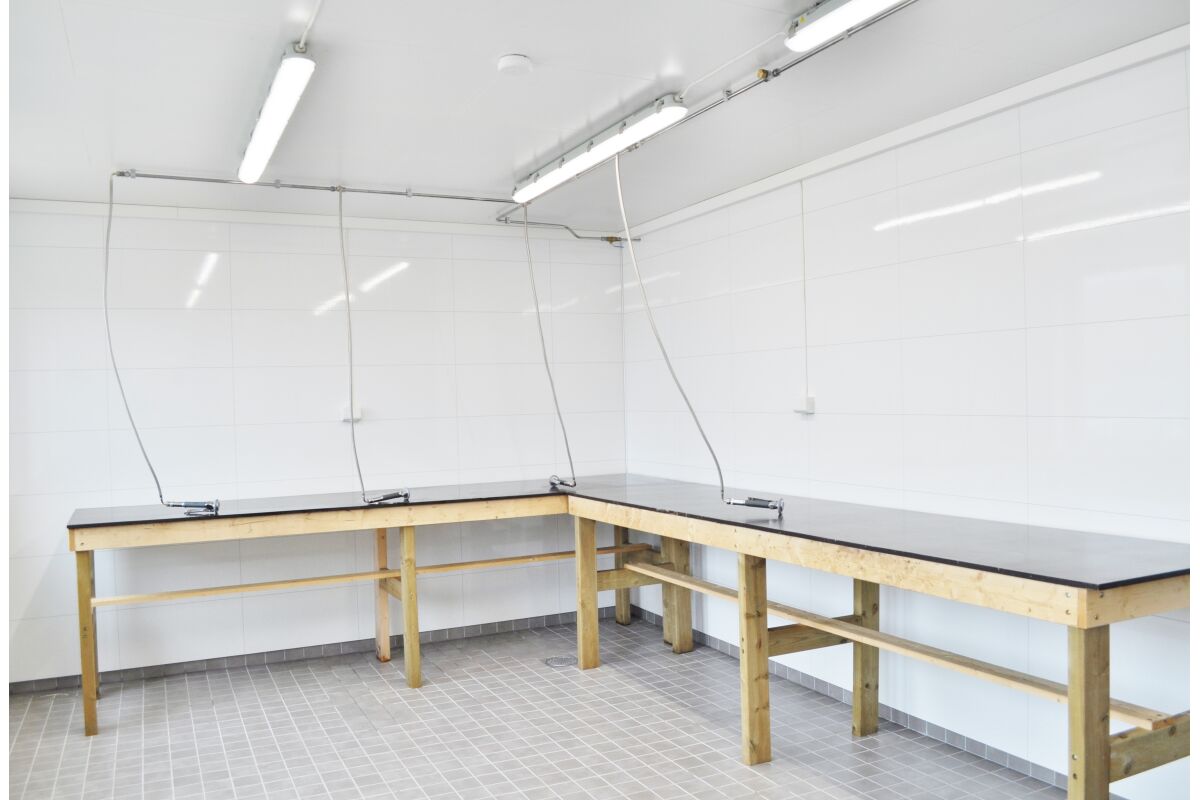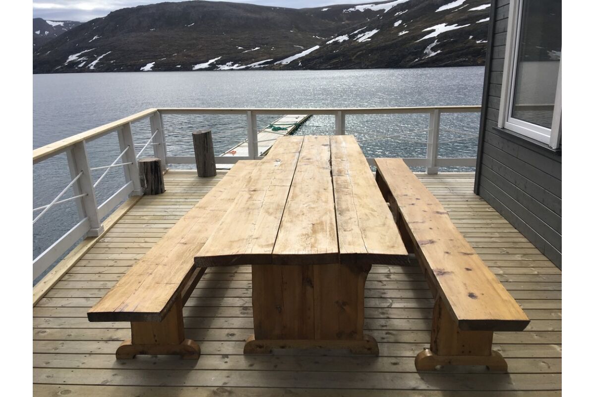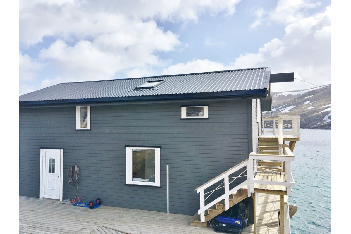 Naast de twee woonunits is er ook een service huis. Hier bevindt zich de overdekte fileerruimte met stromend water en ruime snijtafels. Natuurlijk is hier ook de grote vriezer zodat je de vis snel en comfortabel kan invriezen. Verder is er een ruimte met verwarming waar je je vispakken kan ophangen zodat je de volgende dag weer in een droog pak kan stappen. Boven in het service huis is ook nog een aparte woonunit voor 3 tot 4 personen wat ook wordt verhuurd. Er is ook nagedacht als je een grote hoeveelheid vis hebt gevangen en deze naar boven moet krijgen naar de fileerplaats. Hiervoor is een grote hydraulische kraan geplaatst om de kisten naar boven en beneden te kunnen tillen.