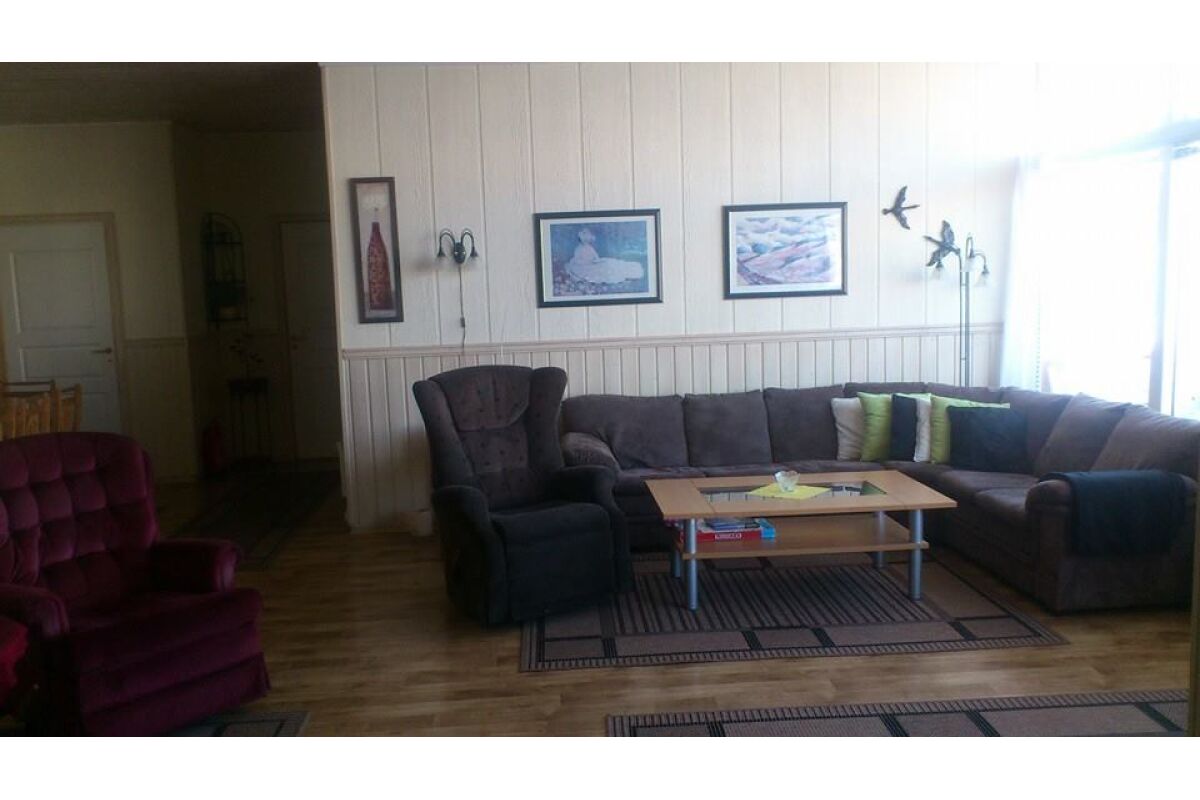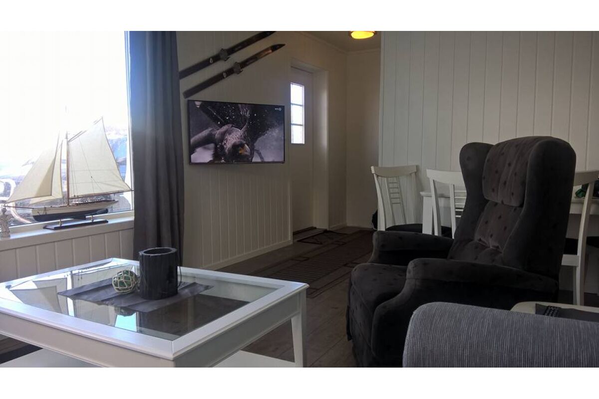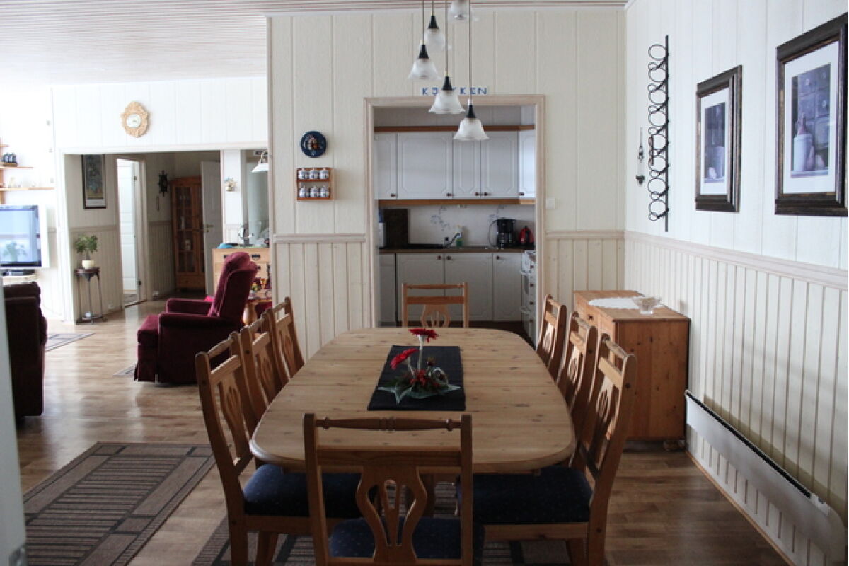 Deze woning heeft alles wat wij vissers nodig hebben. Het is 120 m2 groot en in totaal zijn er 4 slaapkamers met 10 eenpersoonsbedden. De keuken is volledig ingericht met magnetron, waterkoker, oven, 4 pits fornuis, vaatwasser, koelkast en vriezer. Er is daarnaast nog een terras van 20 m2 wat uitkijkt over de fjord en waar een BBQ is inbegrepen bij het tuin meubilair. Het is netjes maar enigszins gedateerd. Maar met je ogen dicht merk je daar niet zo veel van.